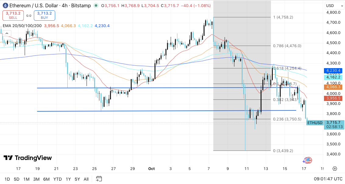 Ethereum continues to commerce with bearish momentum after failing to regain power above the $3,943 mark, which coincides with the 0.382 Fibonacci retracement degree. The worth stays beneath the 20-50 EMA cluster round $3,950-4,100, confirming the presence of robust promoting strain.