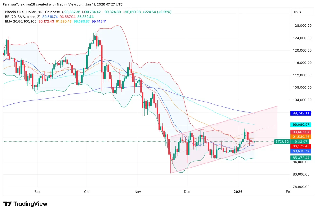 Bitcoin value in the present day is buying and selling inside a symmetrical triangle on the each day chart, with the worth sitting simply above the decrease trendline close to $89,500. The triangle has been compressing volatility since mid-December and is nearing the apex that might usually power a decision.