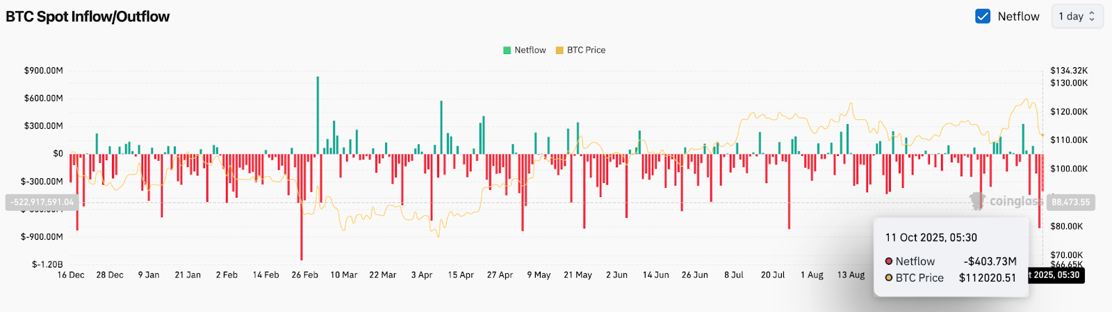In keeping with Coinglass information, there was a internet outflow of $403.7 million on October 11, following the $522.9 million in withdrawals recorded earlier this week. This constant outflow development means that buyers are withdrawing Bitcoin from exchanges regardless of volatility, an indication usually related to accumulation and long-term storage.