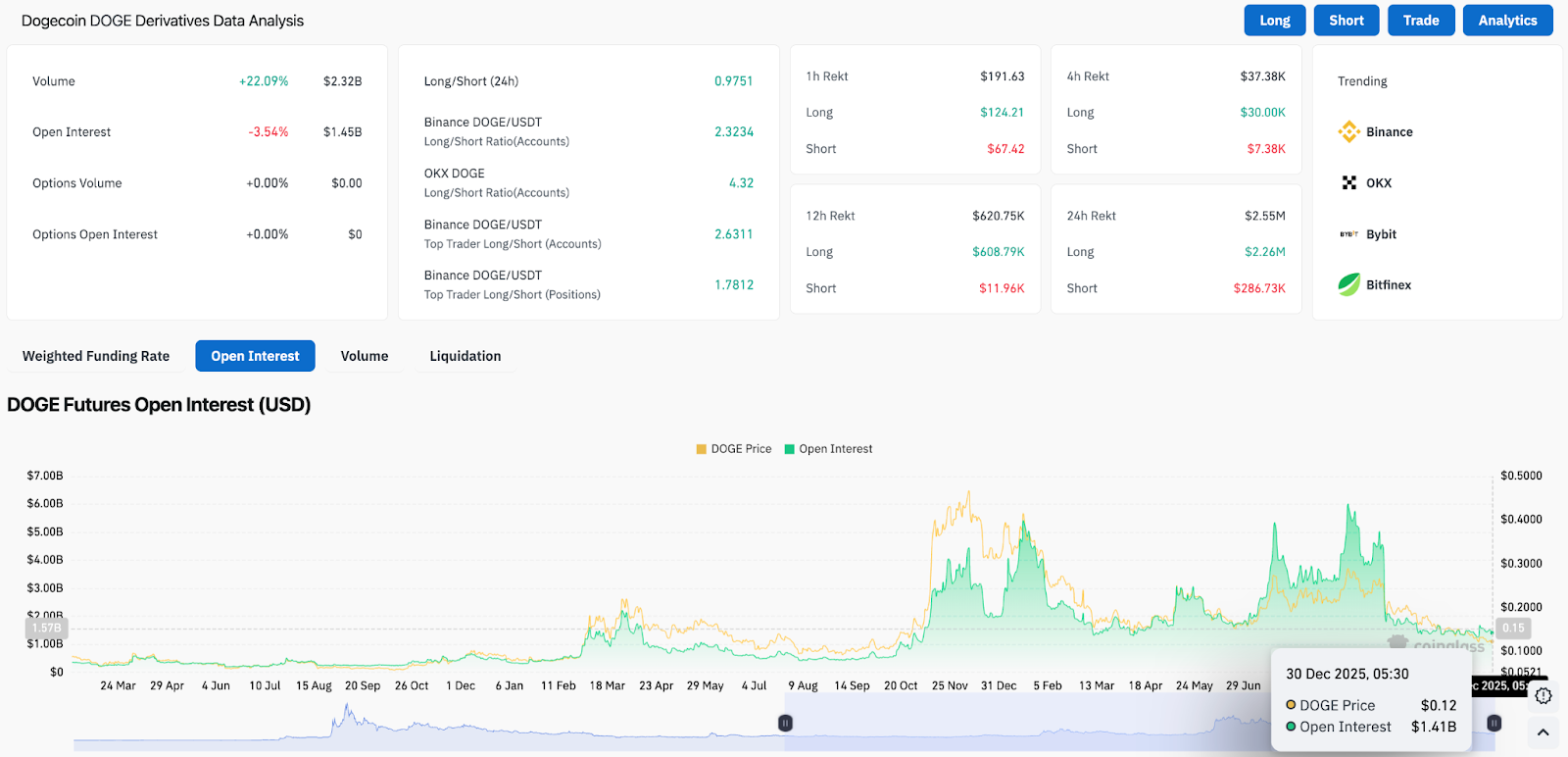 Dogecoin value is buying and selling round $0.123 as we speak, stabilizing simply above short-term assist after weeks of sustained promoting stress. On the every day chart, costs stay locked in a descending channel, with sellers in management as patrons wrestle to power a development reversal heading into the ultimate buying and selling day of 2025.