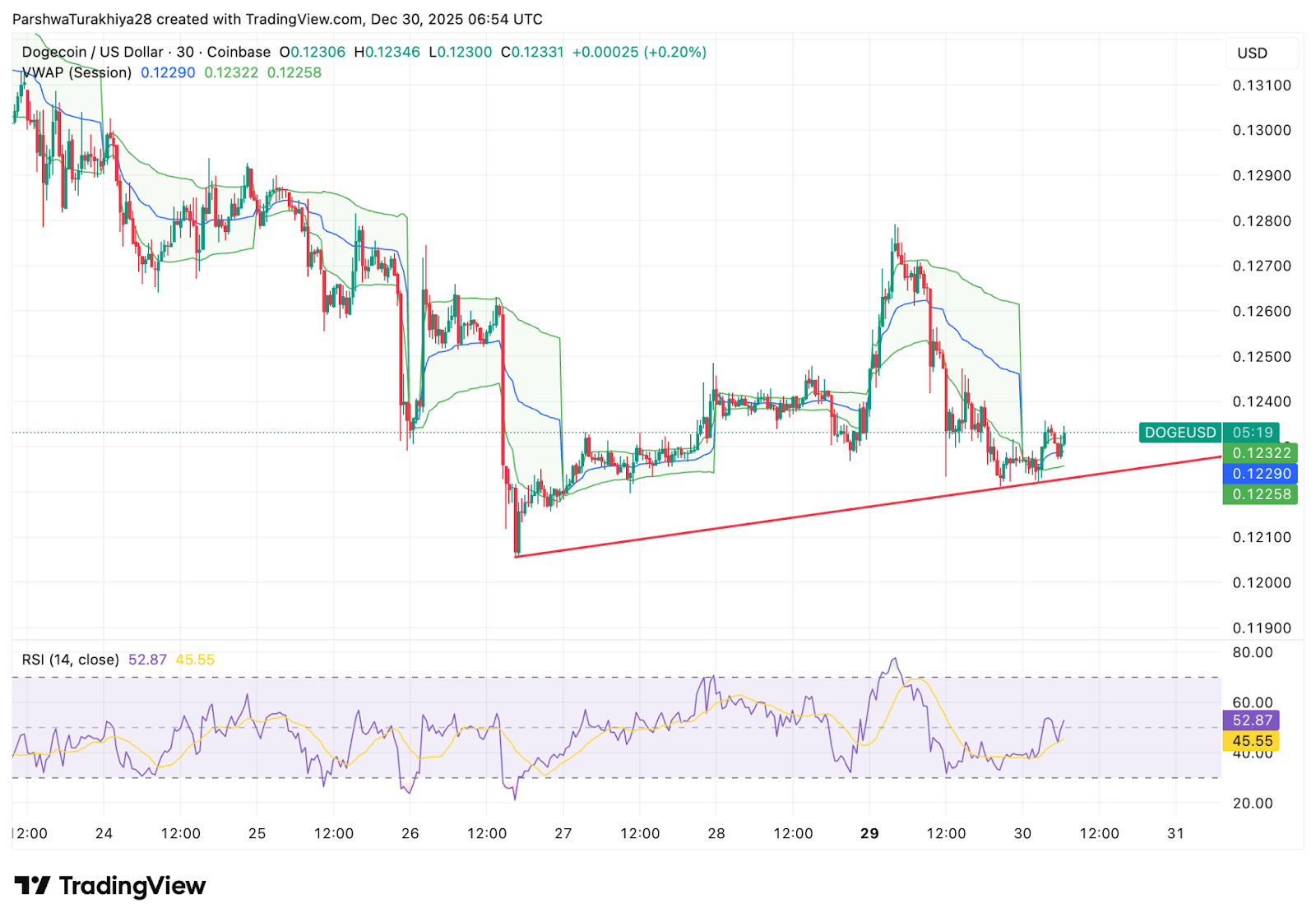 The decrease time-frame signifies that DOGE is making an attempt to stabilize after final week’s decline. On the 30-minute chart, the worth stays above the intraday uptrend line and is buying and selling across the session VWAP of $0.123. This implies short-term patrons are attempting to guard worth, however confidence continues to be restricted.