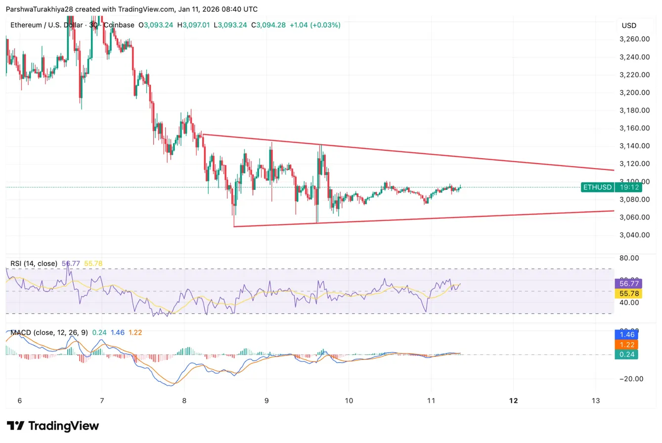 After recording spot inflows of $13.59 million on January 11, Ethereum value is buying and selling round $3,093 at present, reversing the distribution sample that had put stress on ETH all through December. The token has been consolidating inside a triangle sample with compressed volatility for weeks, with the catalyst for a community improve on the horizon, as analysts preserve their 2026 targets between $4,000 and $9,000.