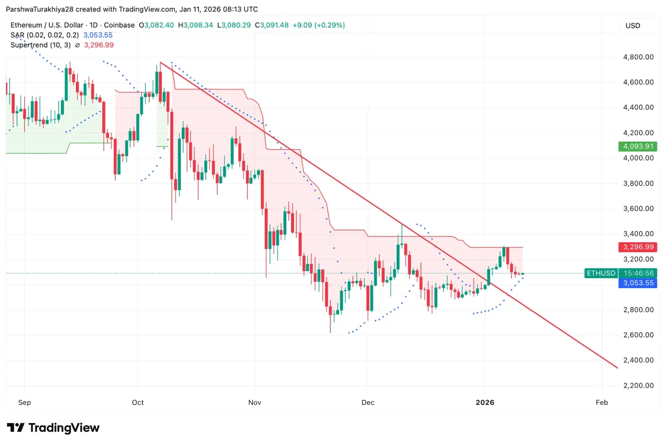 Parabolic SAR is $3,053, barely beneath present value. This means that so long as ETH stays above this degree, short-term momentum will stay impartial to bullish. Nonetheless, the $3,296 supertrend indicator stays bearish and is presently nicely above the value, marking the primary main resistance zone.