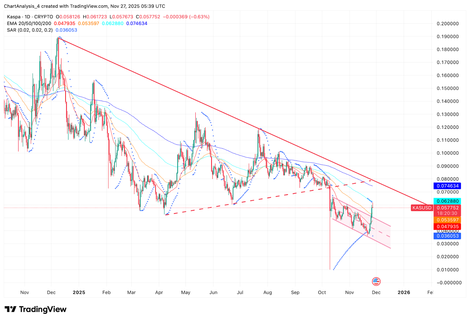 KAS is at the moment buying and selling above its 20-day EMA of $0.0479 and 50-day EMA of $0.0535, indicating a short-term momentum change. The 100-day EMA continues to be overhead at $0.0628 and the 200-day EMA is $0.0746. These shifting averages nonetheless type a broader ceiling that defines a bearish pattern.