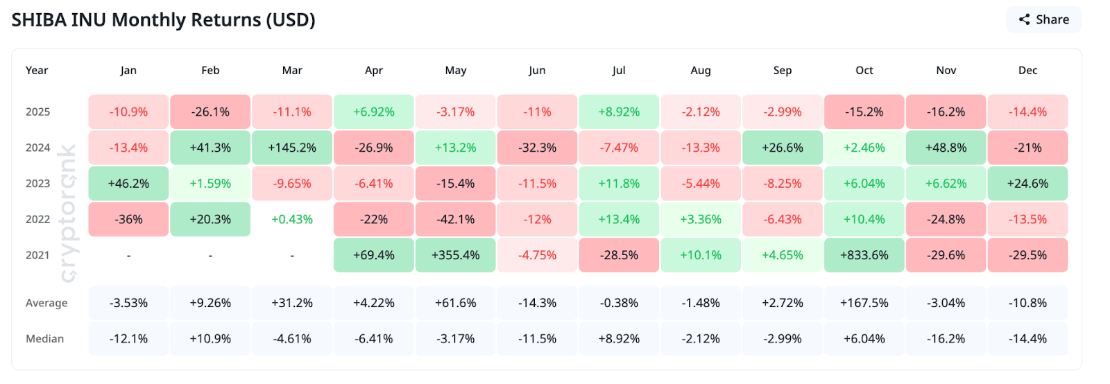 Traditionally, December has been a troublesome month for SHIB. December returns have been negatively skewed for a number of years, with median losses exceeding 14%, in keeping with the information. This seasonal stress provides additional resistance to any restoration makes an attempt later within the month.