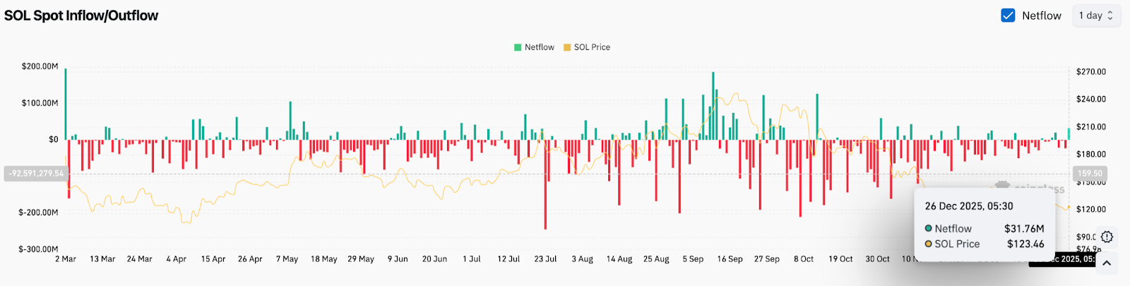 Spot movement information reveals slight enchancment. On December 26, Solana traded at a value round $123.5, with web inflows of roughly $31.7 million. Whereas not a sudden surge, it marks a change from the excessive outflows seen in October and November.