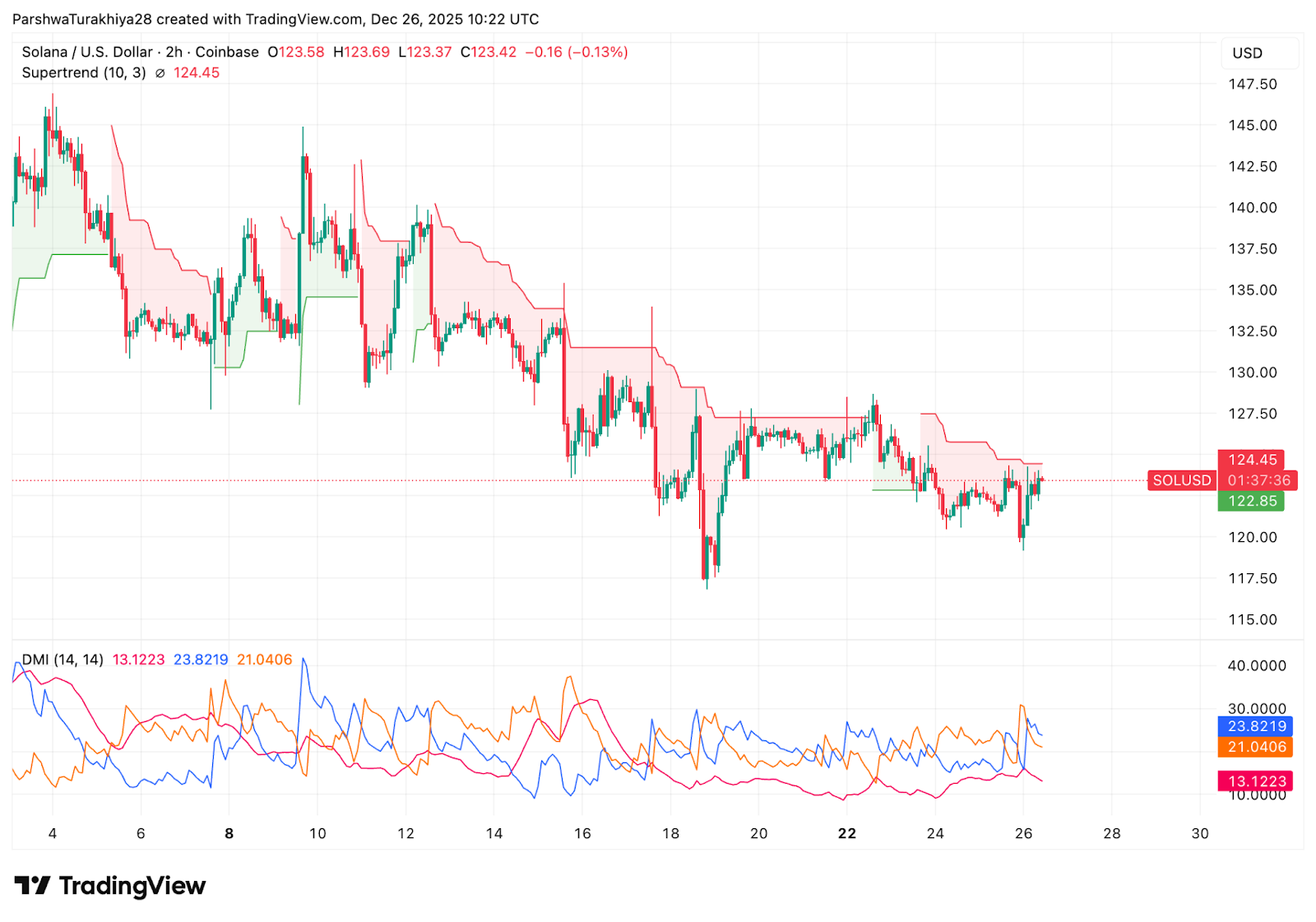 On the 2-hourly chart, SOL is making an attempt to construct a short-term base above $122. The supertrend stays bearish close to $124.4, limiting any upside makes an attempt. Intraday momentum stays impartial to weak till value reverses to that stage.