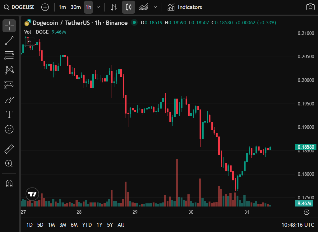 Dogecoin (DOGE) value is at present $0.1856, displaying a slight decline of 1.7% within the current previous. 24 hours. Regardless of the decline, it nonetheless maintains an enormous market capitalization. $28.1 billion The 24-hour buying and selling quantity is equally giant. 2.5 billion {dollars}proving that liquidity and investor curiosity stay excessive.