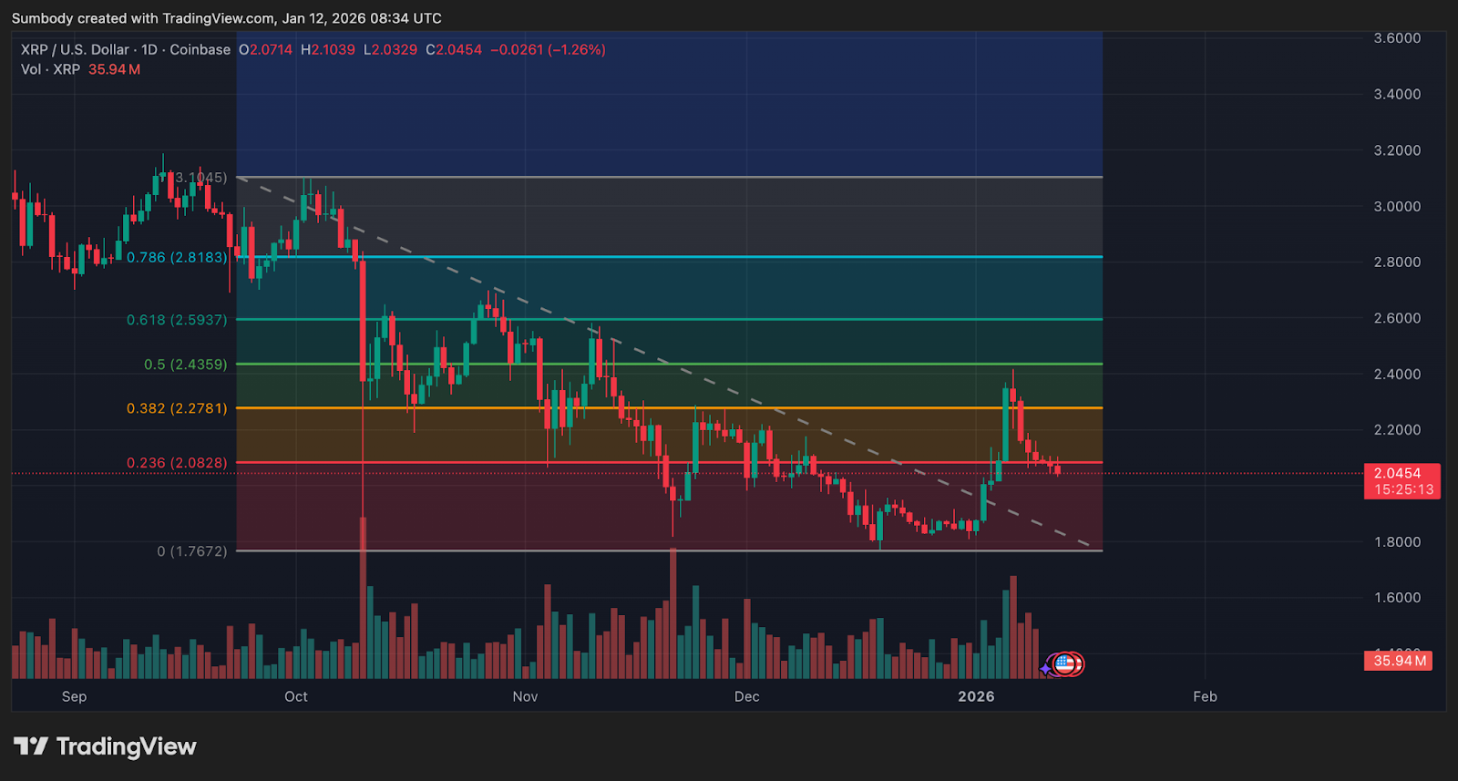 XRP is buying and selling at $2.04 on the time of writing, reflecting a rebound of roughly 50% of the full acquire from the spectacular rally within the first week of 2026. Regardless of the bullish enchantment, the cryptocurrency has fallen beneath notable assist ranges, suggesting bullish momentum is being misplaced.