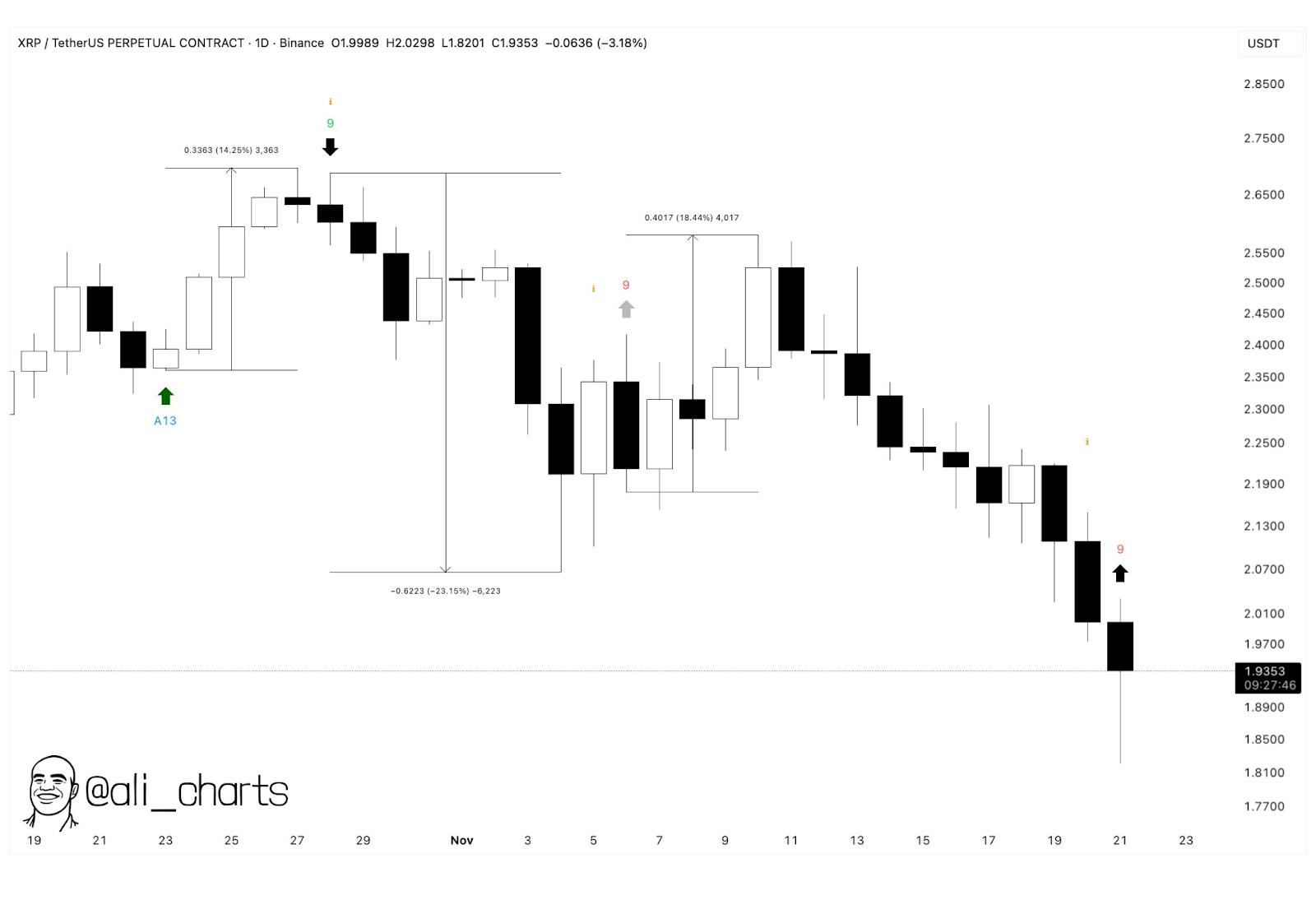 In response to a chart shared by analyst Ali Martinez, 1.8 billion XRP was beforehand bought at round $1.75, which has been established as a key help degree. Moreover, the analyst mentioned in one other put up that the TD Sequential indicator flashed a purchase sign for XRP. This indicator has traditionally predicted bottoms for XRP, usually resulting in notable upside value actions.