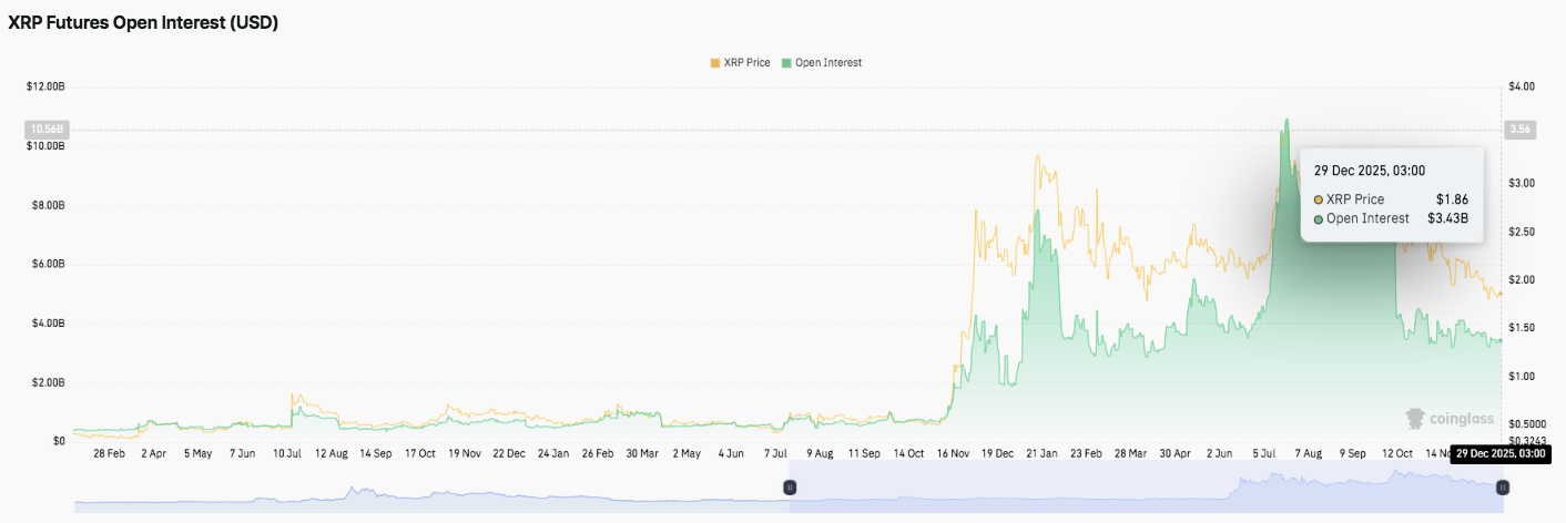 XRP futures knowledge supplies additional perception into market tendencies. Open curiosity expanded quickly throughout the November rally, confirming the energy of speculative participation. This part ended with a noticeable unwinding as costs fell.