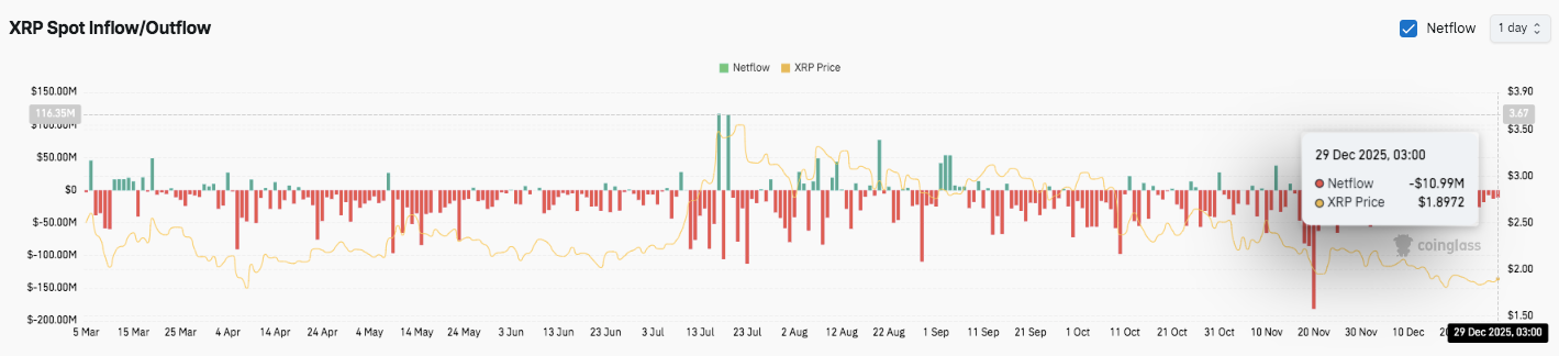 Spot buying and selling knowledge paints a extra cautious image. XRP has recorded an extended interval of web outflows, indicating constant stress on the vendor facet. A short lived spike in inflows occurred throughout the rebound, however rapidly dissipated. Moreover, latest capital outflows of almost $11 million coincide with continued value declines.